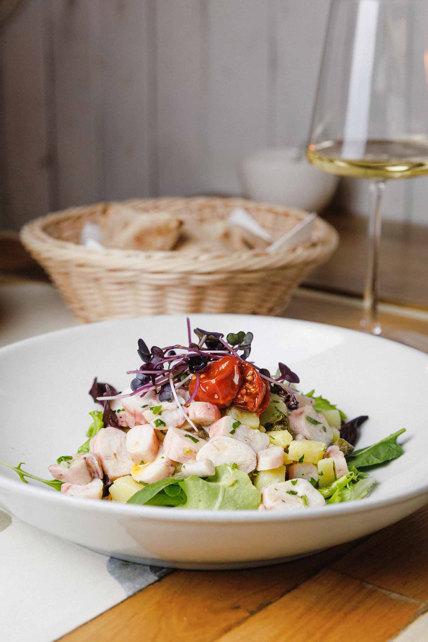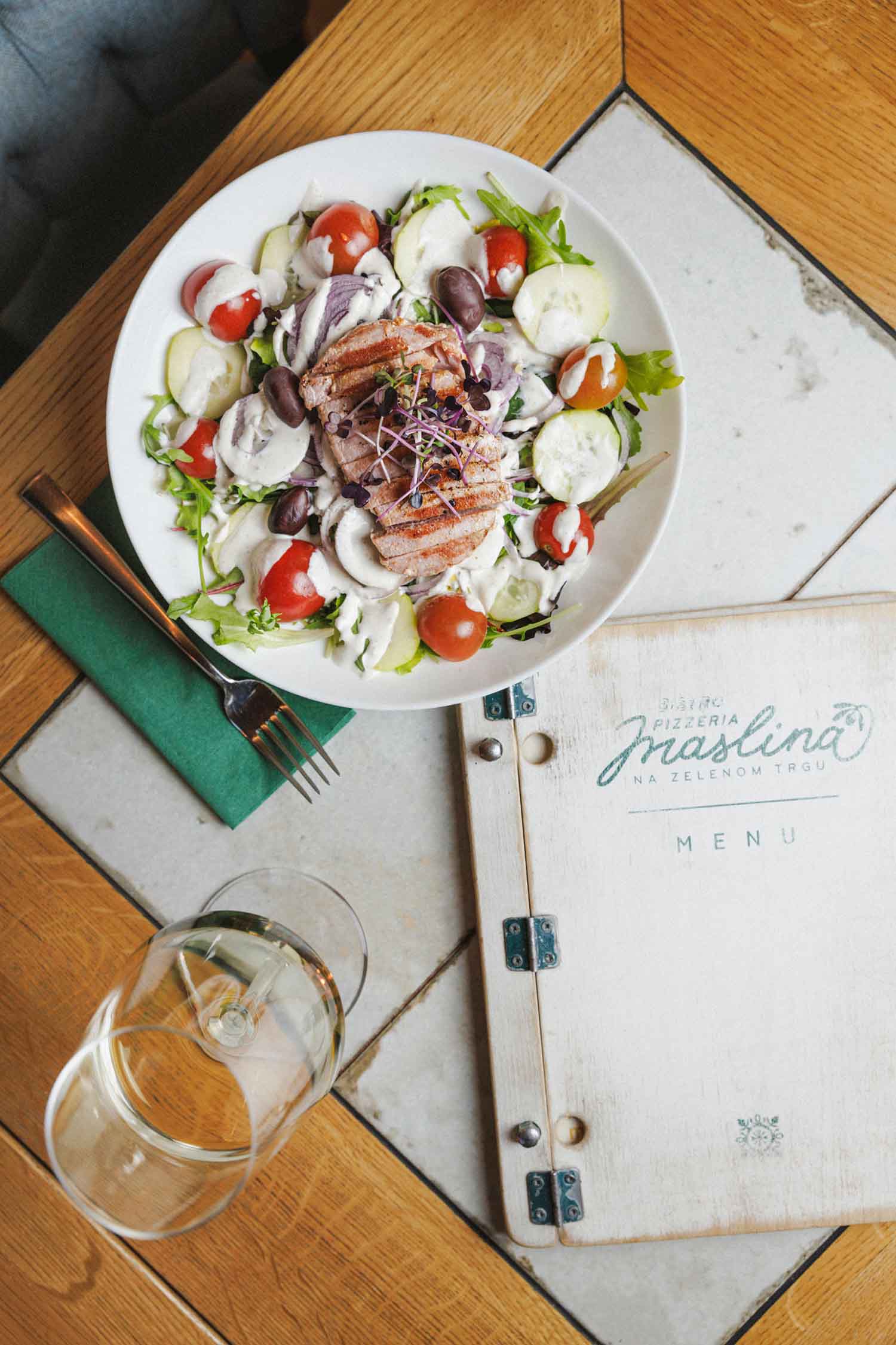Naša kuhinja inspirirana je jednostavnošću i bogatstvom Mediterana – okusima mora, maslinovog ulja, aromatičnog bilja i svježih sezonskih sastojaka koji dolaze s lokalne tržnice, par ulica udaljene. U Maslini vjerujemo da dobra hrana počinje s dobrim sastojcima i zato biramo samo najbolje – svježu ribu, masline, paški sir, domaći pršut, rajčice, tartufe iz Istre, maslinovo ulje vrhunske kvalitete. Svaki tanjur odraz je poštovanja prema tradiciji i strasti prema kuhanju. Svakodnevno nudimo raznovrsna topla i hladna jela, s posebnim naglaskom na sezonsku ponudu – sve pripremljeno s puno pažnje i kreativnosti.