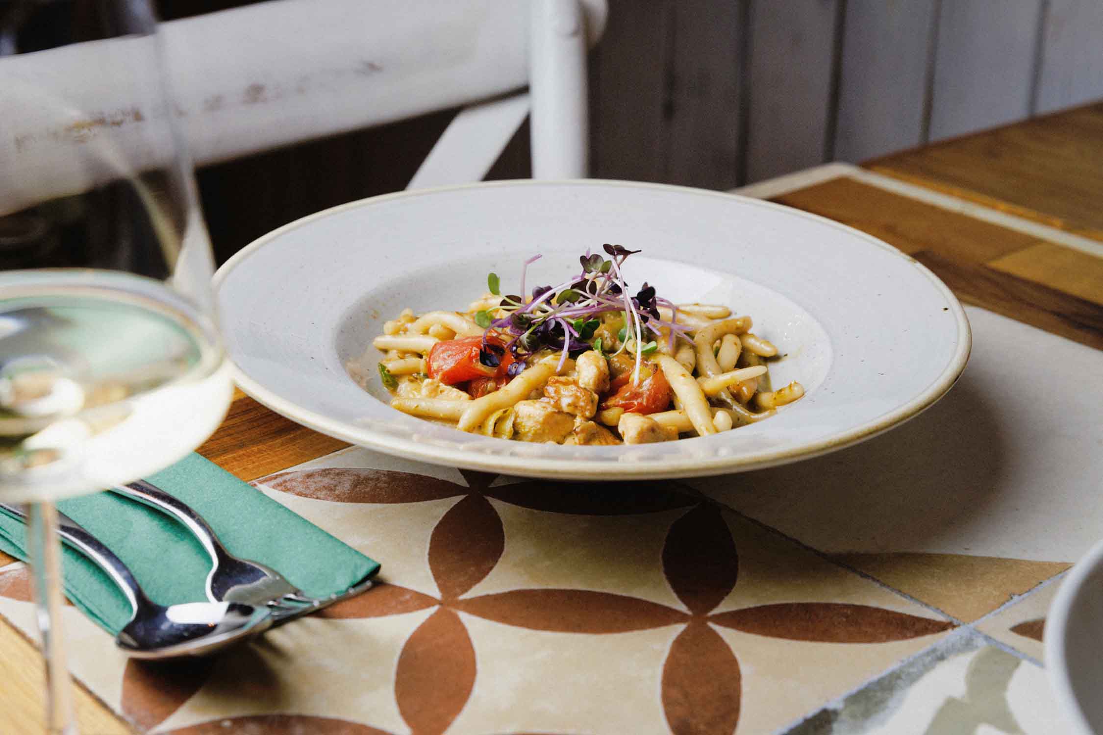 Domaći pljukanci u umaku od domaće svježe piletine, cherry rajčice, mladog luka, tikvica i pesta od bosiljka, parmezan