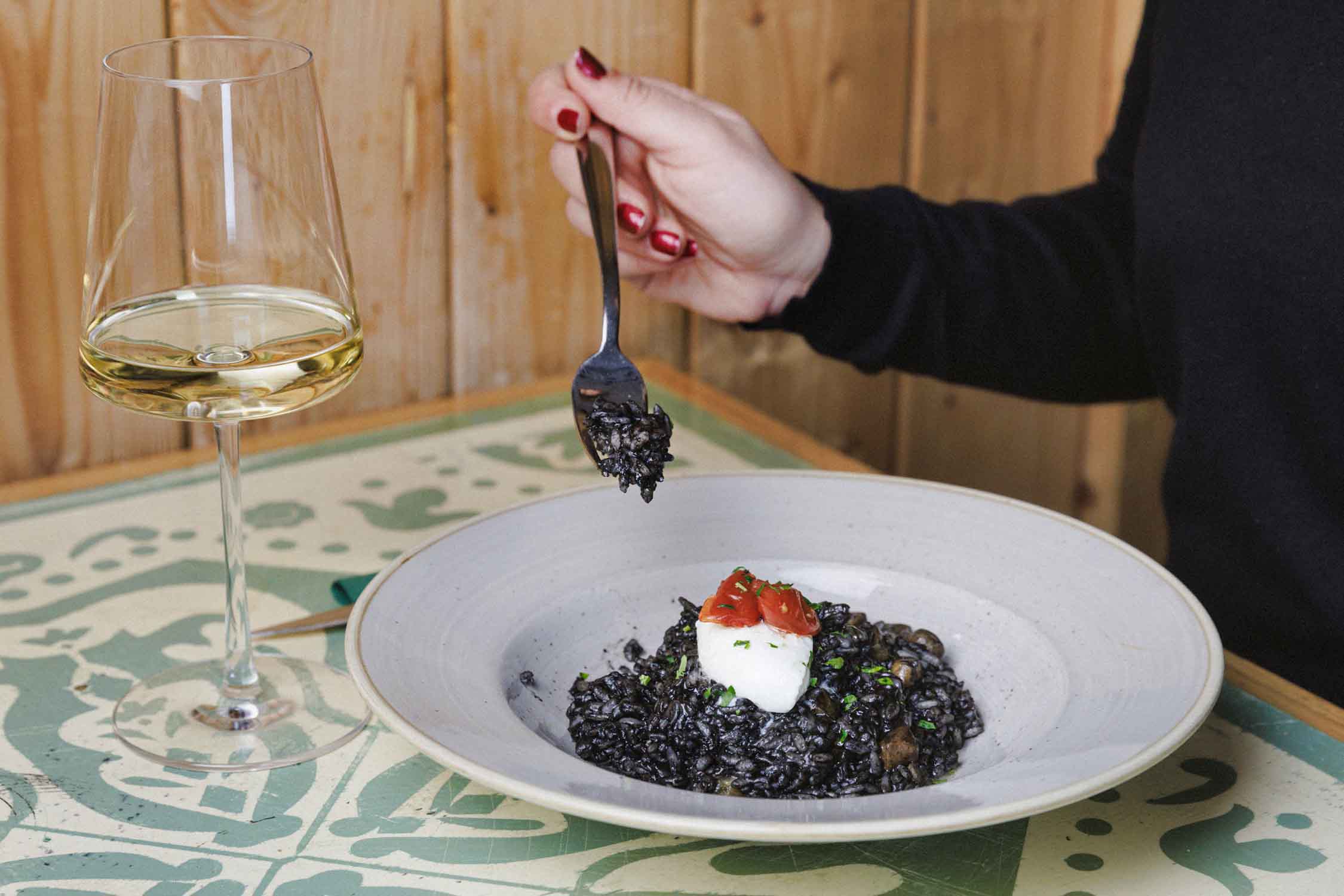 Riža, umak od sipe, češnjaka, peršina, vina i sipinog crnila uz dodatak burrate