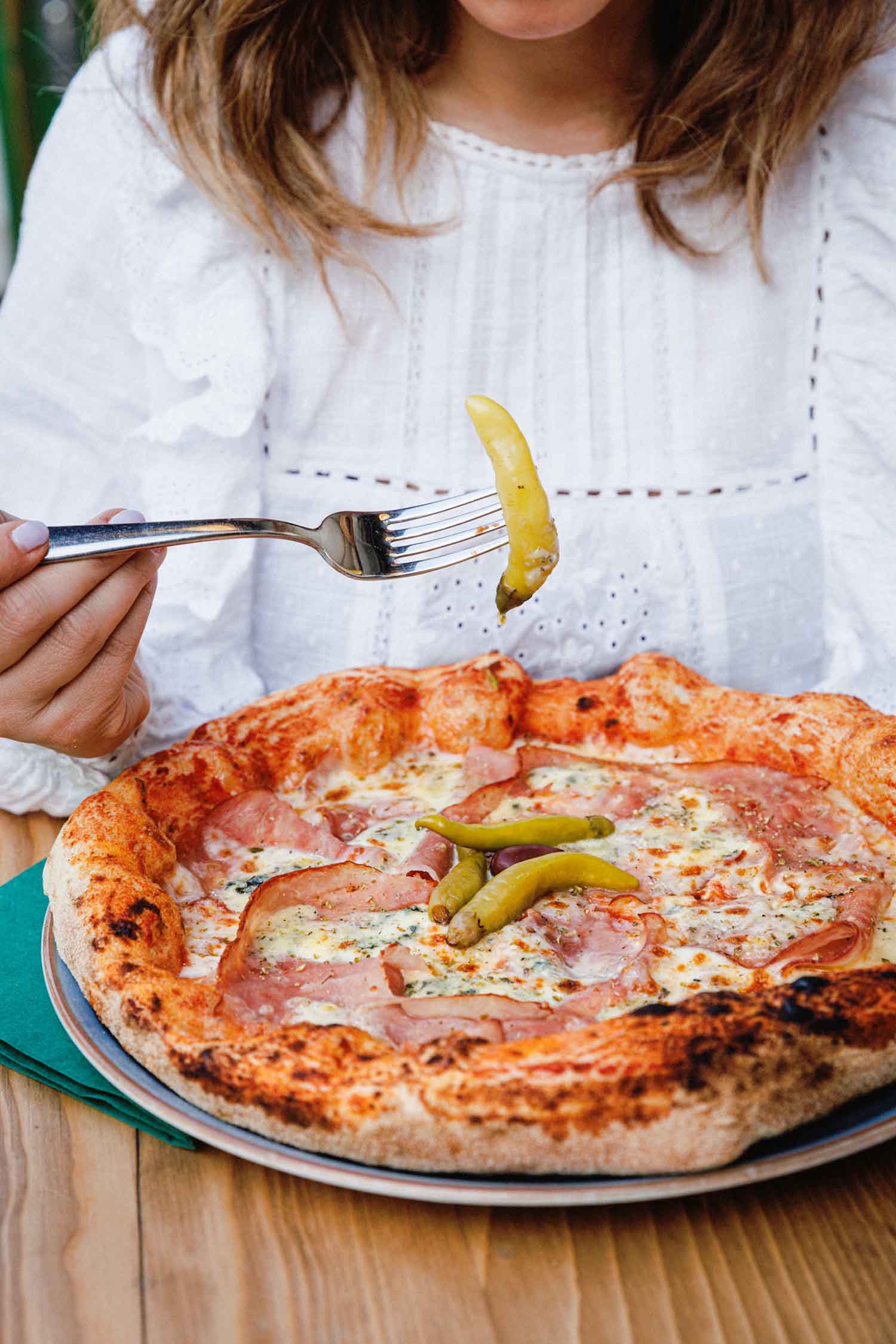 Pelati, sir, šunka, gorgonzola, ljuti feferoni, maslina, origano