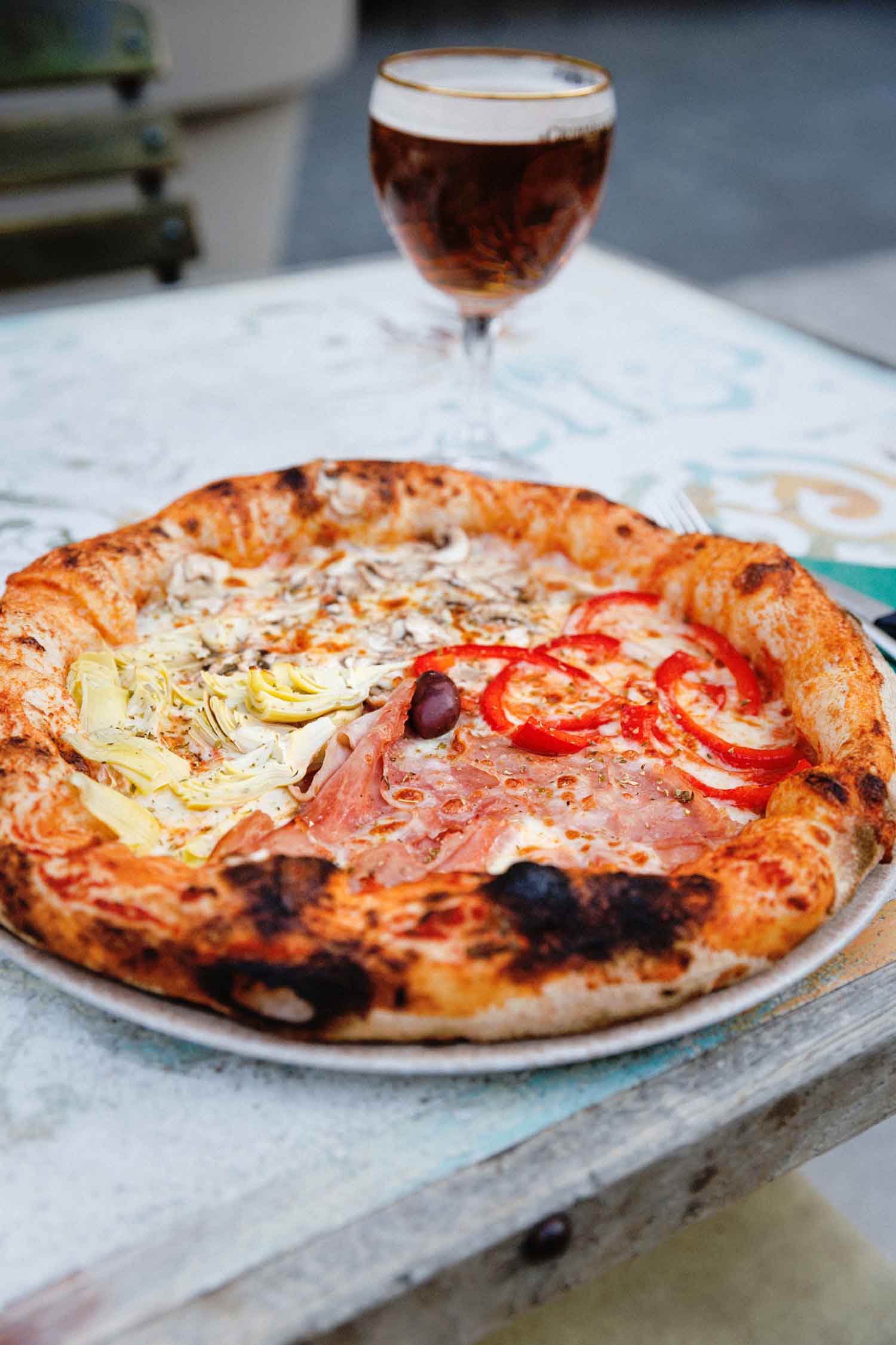 Pelati, sir, slani inćuni, kapari, karamelizirani luk, artičoke, češnjak, maslina