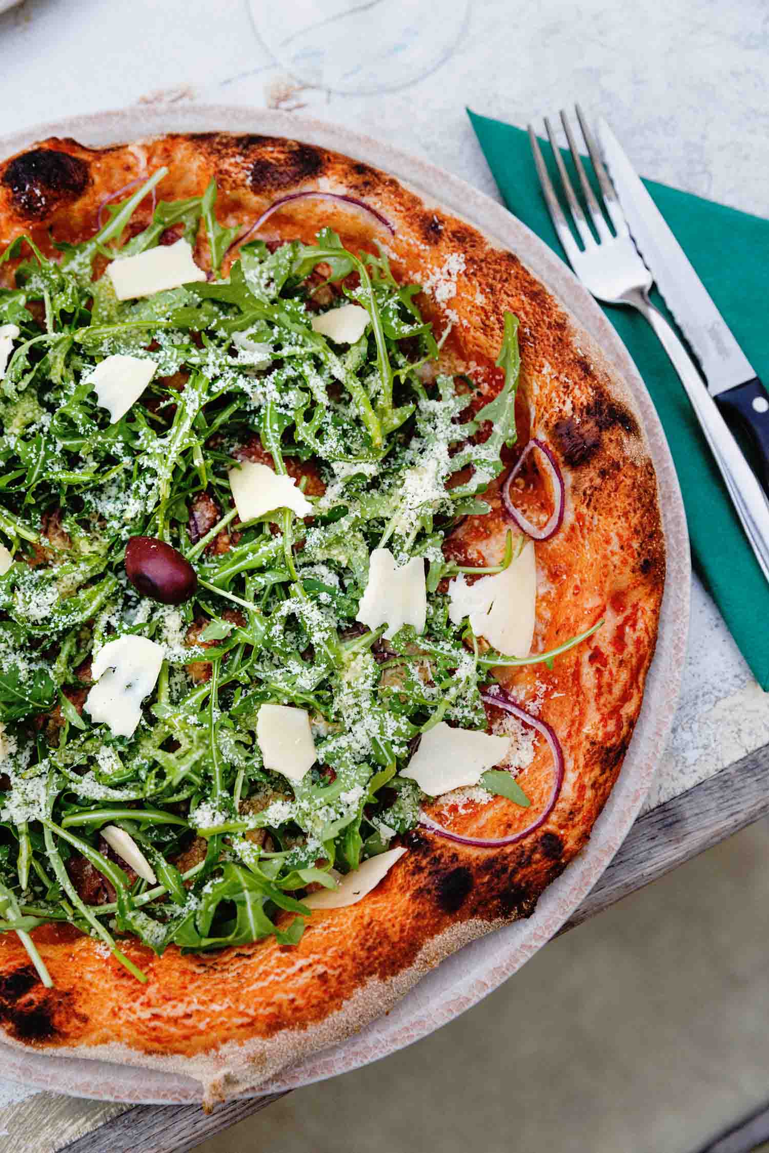 Pelati, sir, luk, panceta, kobasice, rukola, parmezan, maslina, origano