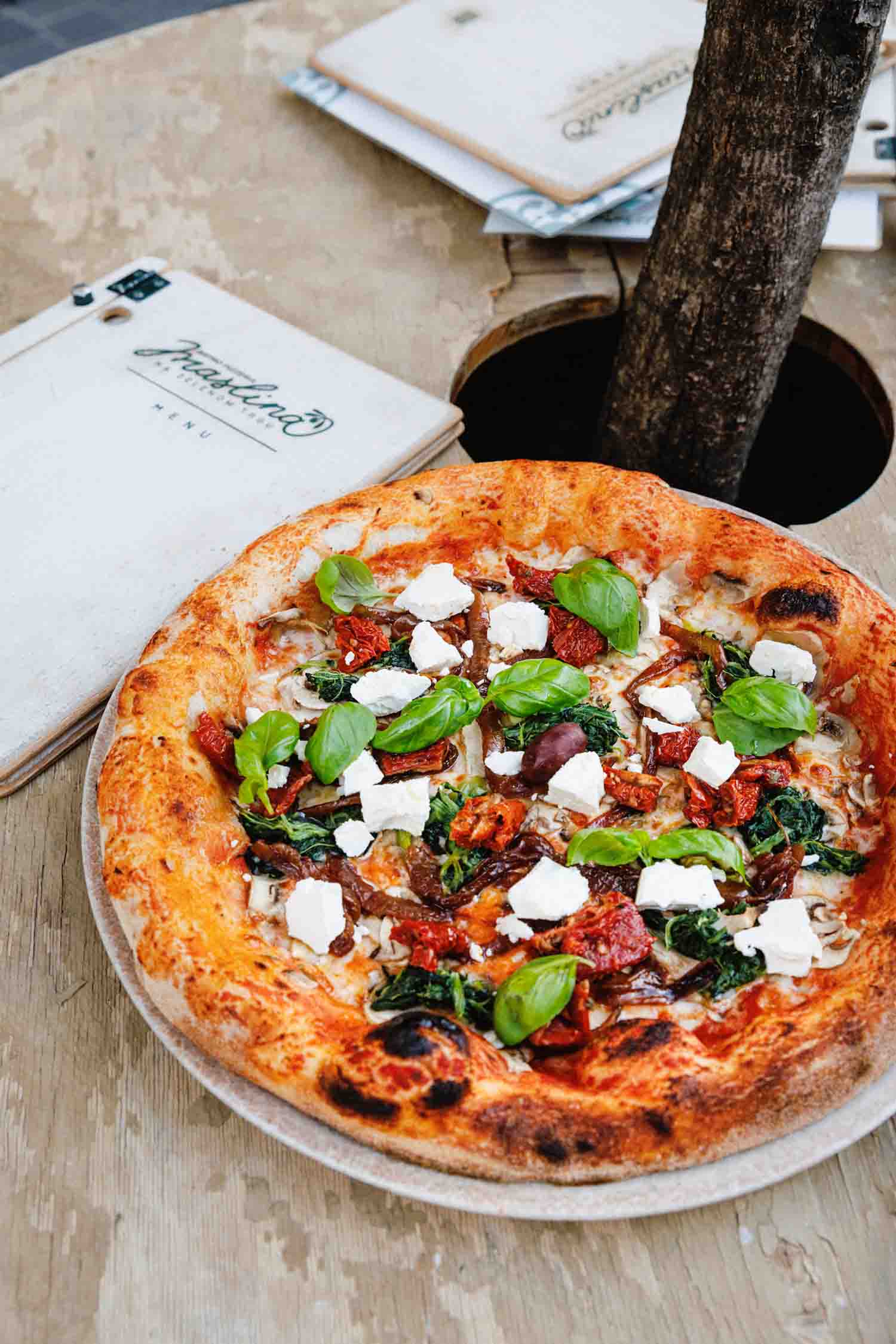 Pelati, sir, karamelizirani luk, šampinjoni, kuhani špinat, sušene rajčice, svježi bosiljak, feta sir, maslina