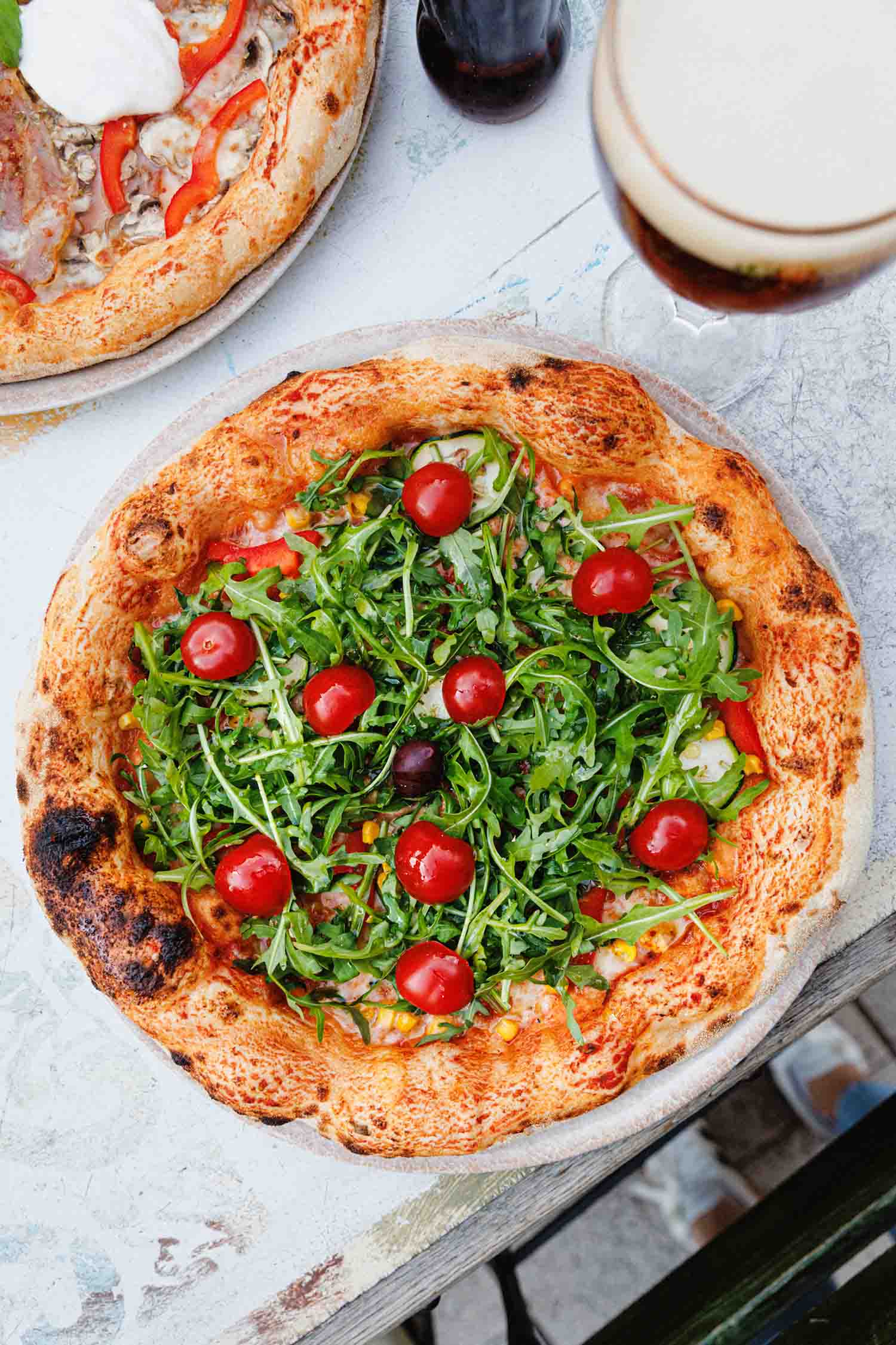 Pelati, sir, rikola, luk, šampinjoni, kukuruz, paprika, tikvice, pomidorini, origano, maslina