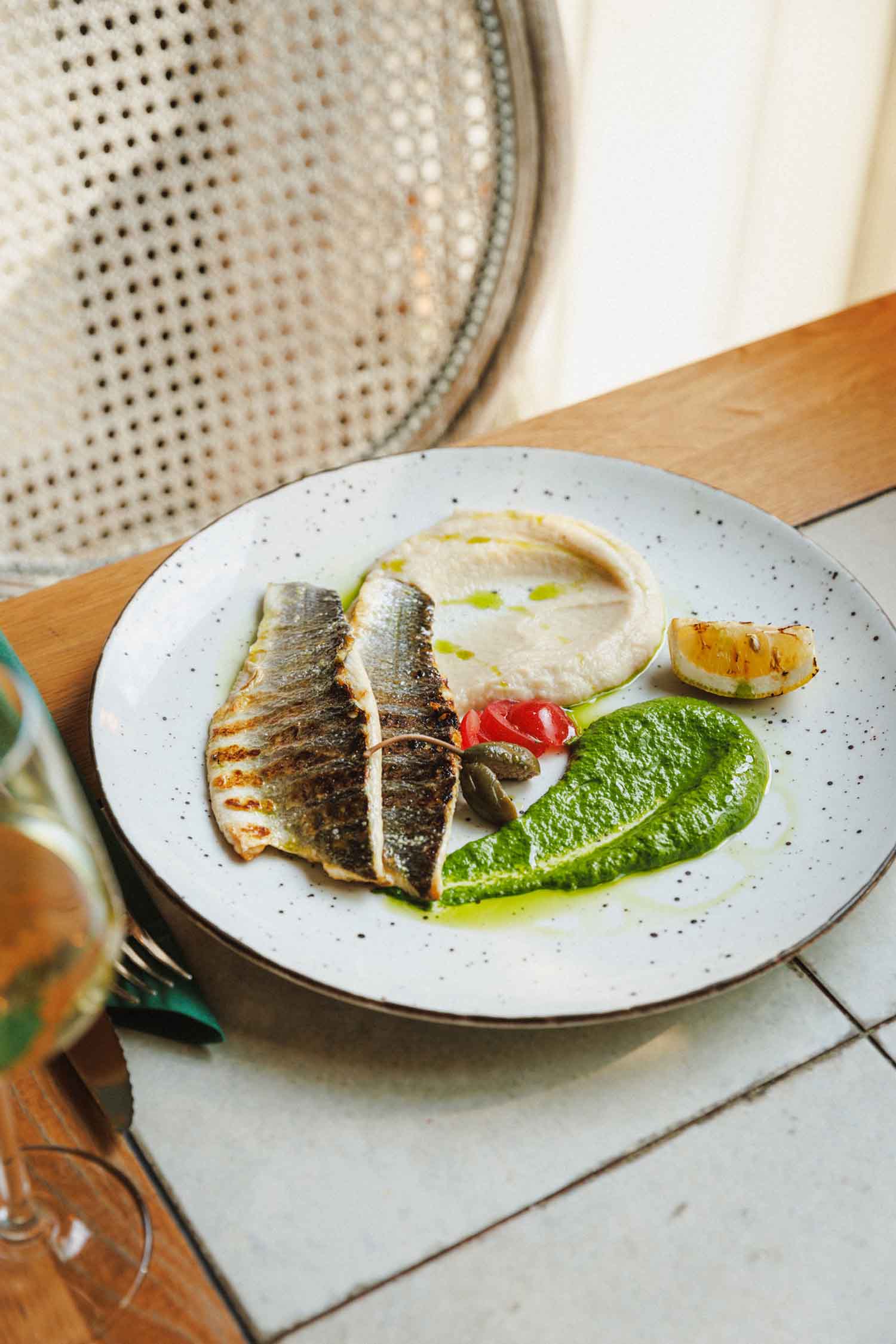 Filet od brancina pečen na lava grillu, poslužen sa pireom od celera i kremom od baby špinata