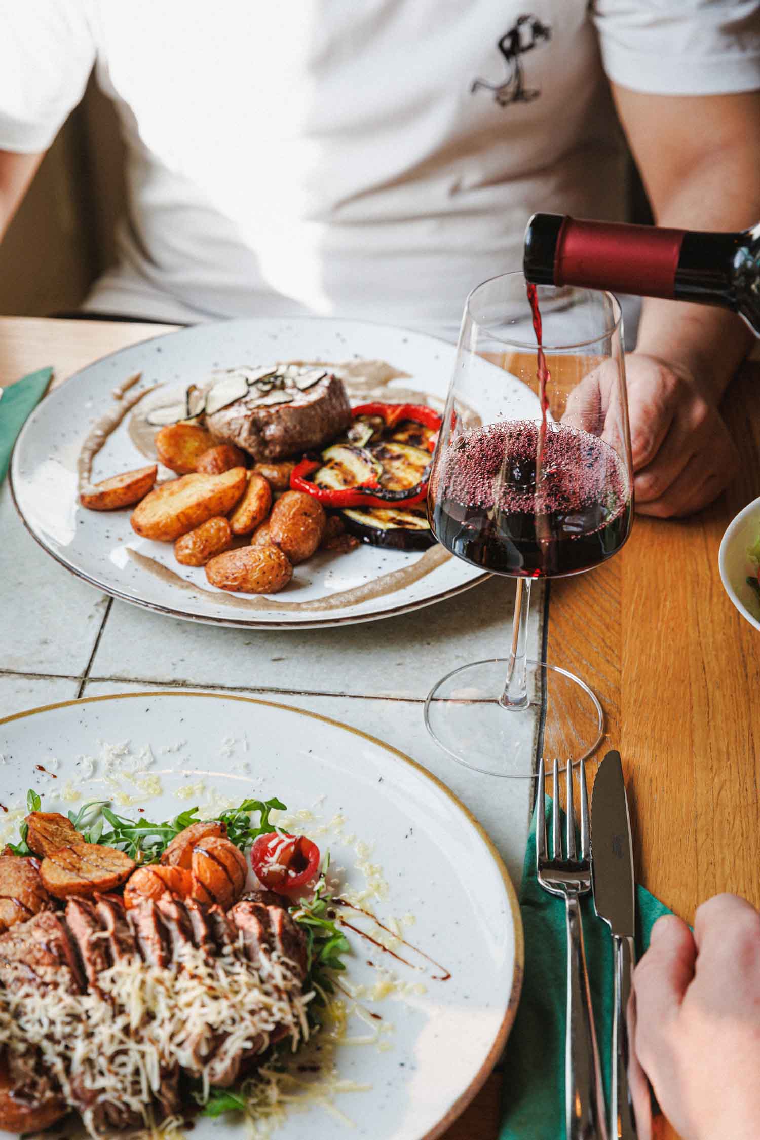 Narezani juneći beefsteak na posteljici od rukole, pečeni mladi krumpir, grana padano sir, reducirani aceto balsamico