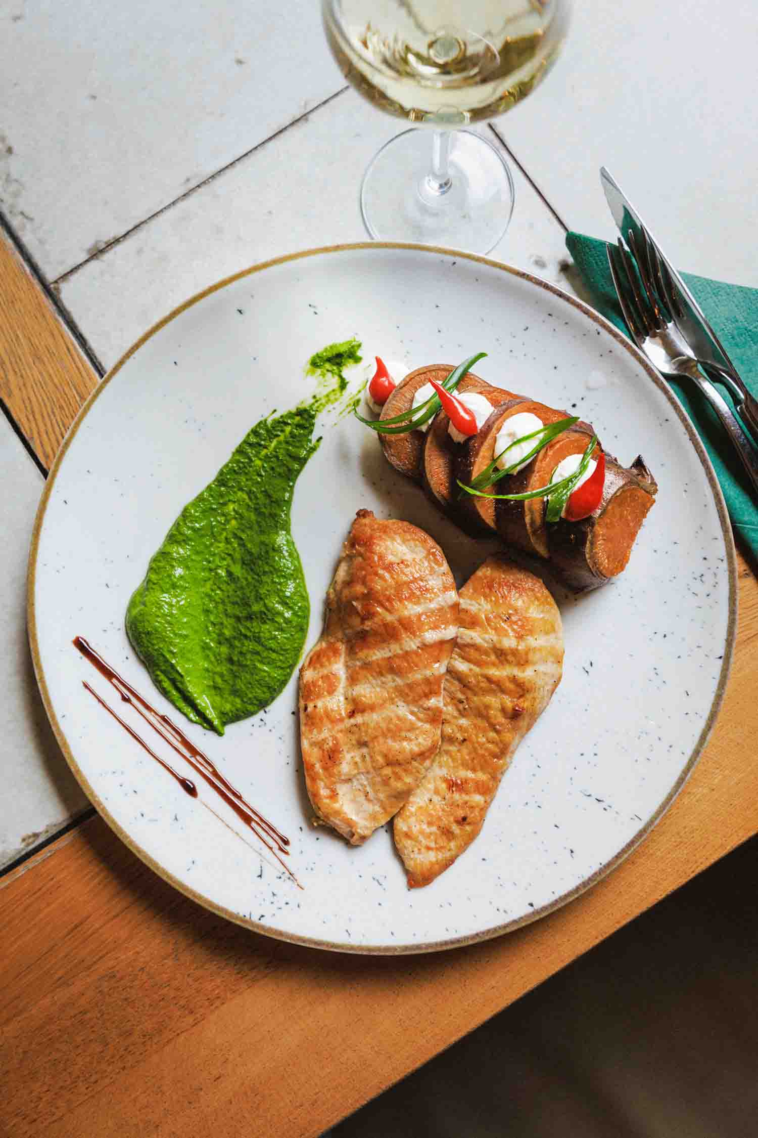 Pileći filet na lavi, zapečeni batat s mladim lukom julienne, krem sirom, kremom od baby špinata i indijskih oraščića
