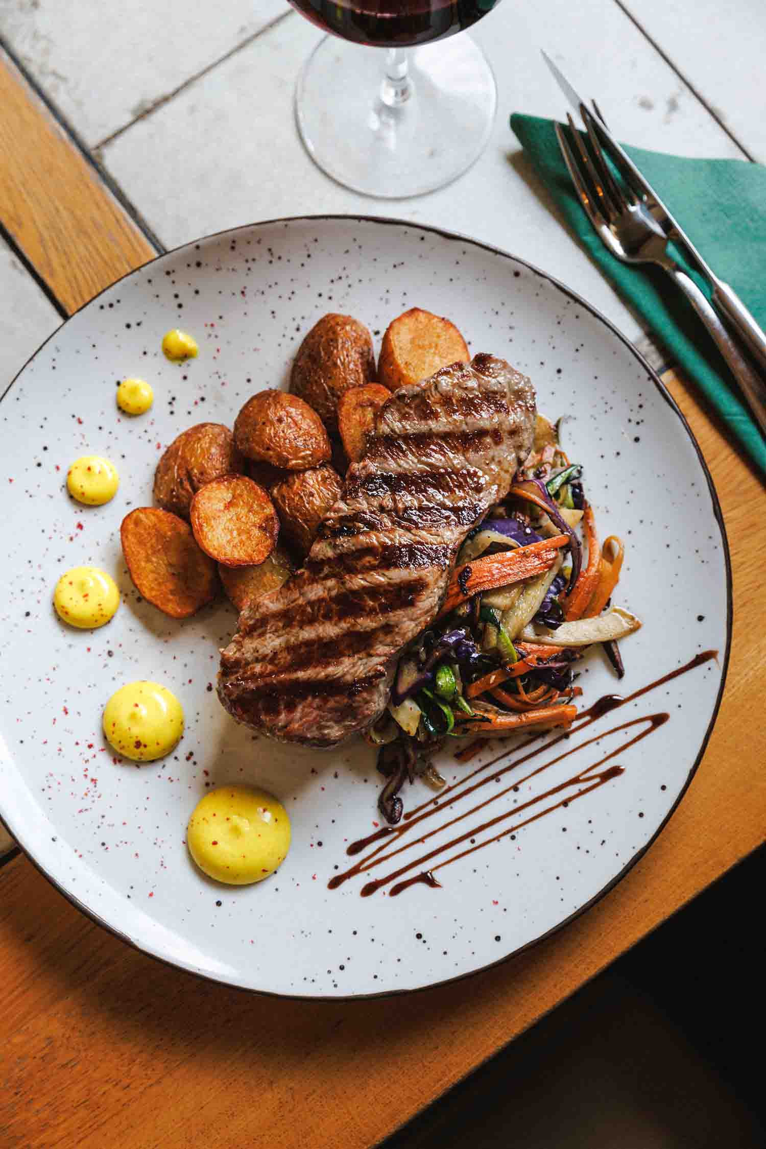Beefsteak u kremi od crnog tartufa, tartufate i ulja od tartufa, povrće na lavi, mladi pečeni krumpir