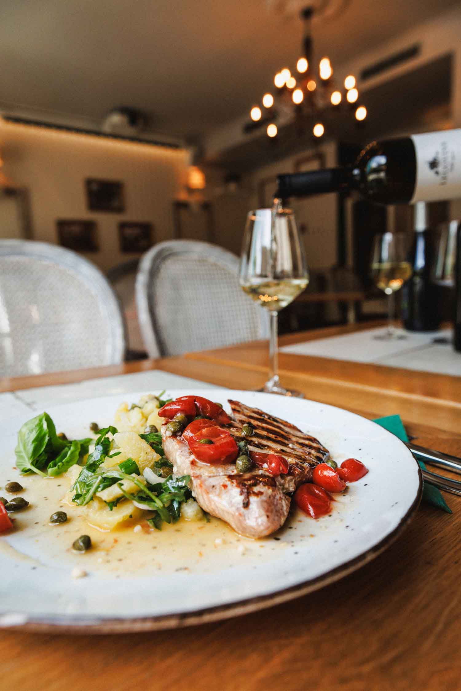 Steak od tune na grillu u umaku od vina, češnjaka, cherry rajčica i kapara s toplim krumpirom na rukoli i mladom luku