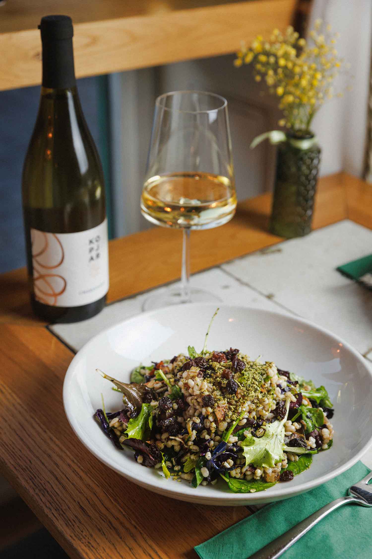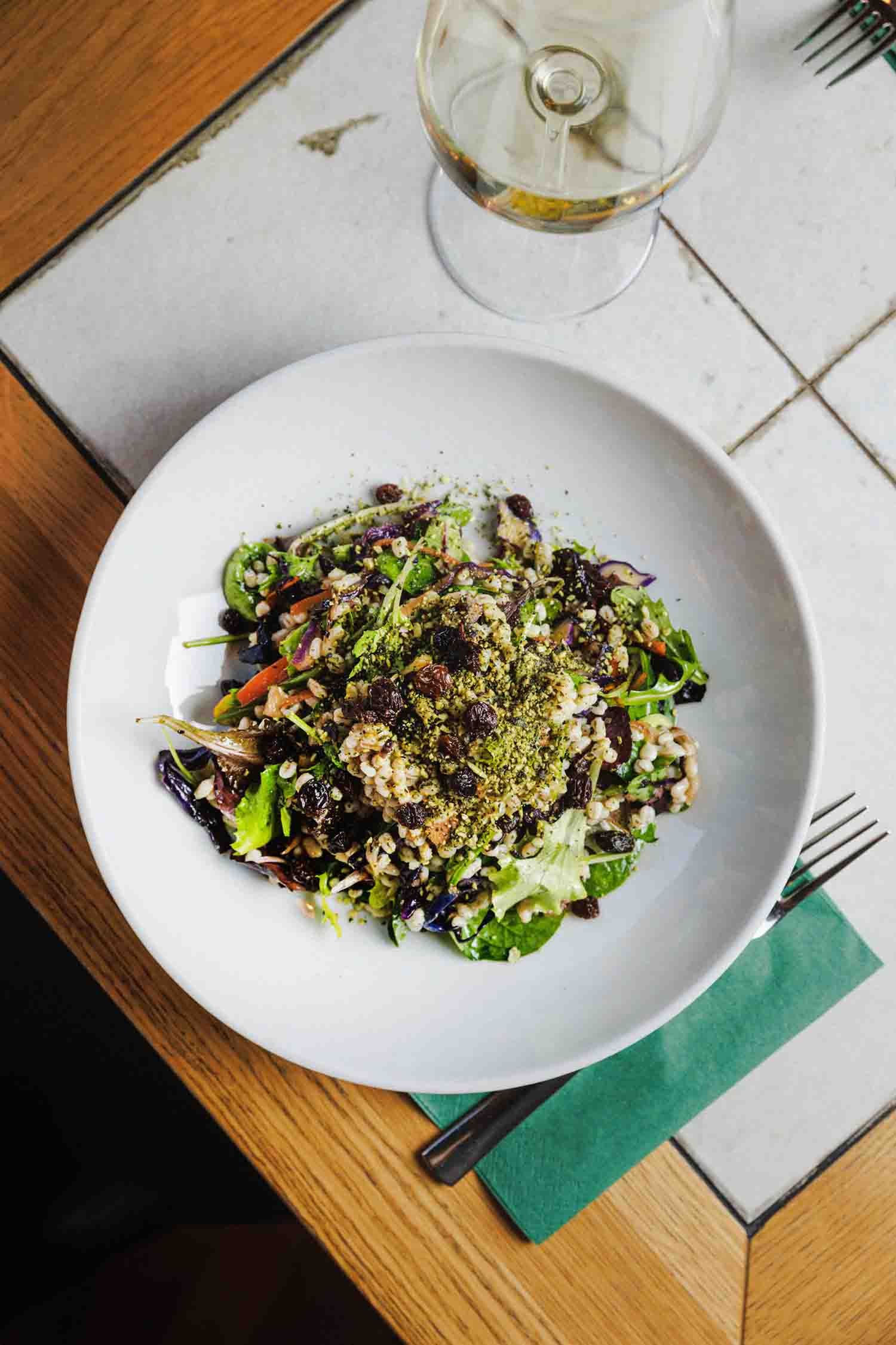 Kuhani ječam, wok povrće, dresing od javorovog sirupa, limuna, dijon senfa, maslinovog ulja i mente, grožđice, bučine sjemenke, indijski oraščići, pinjoli