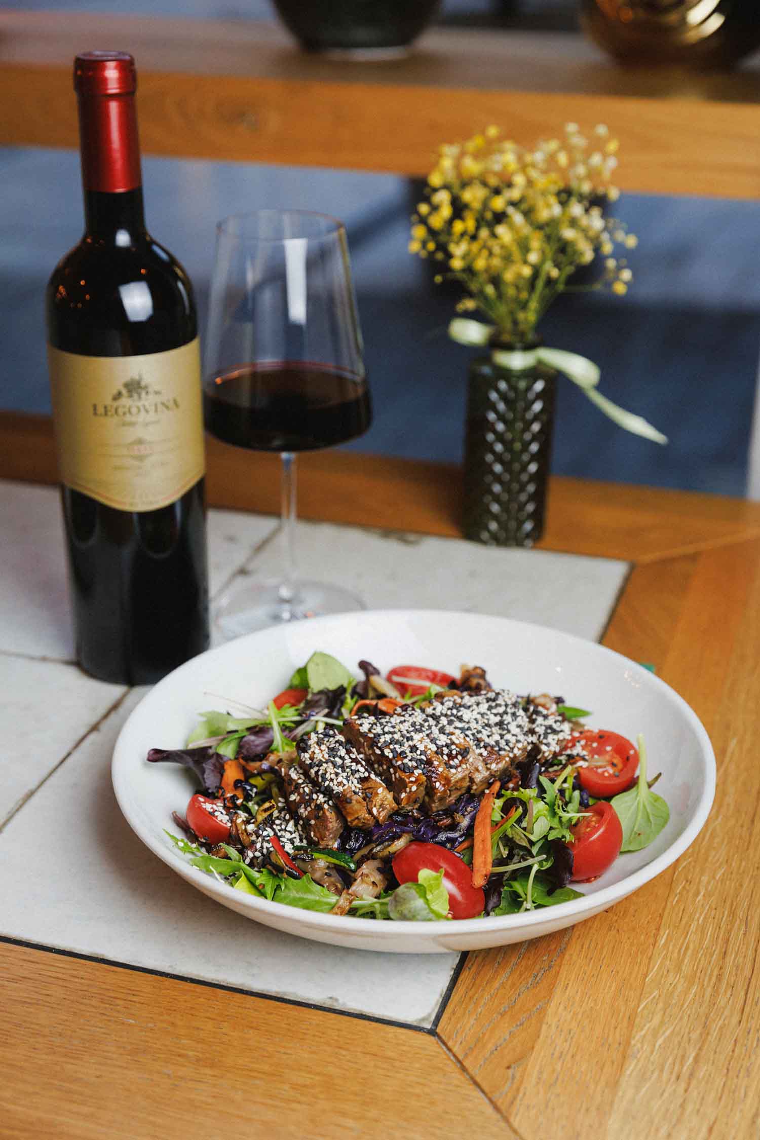 Rumpsteak na lavi, povrće wok, mišancija, teryjaki umak, sezam