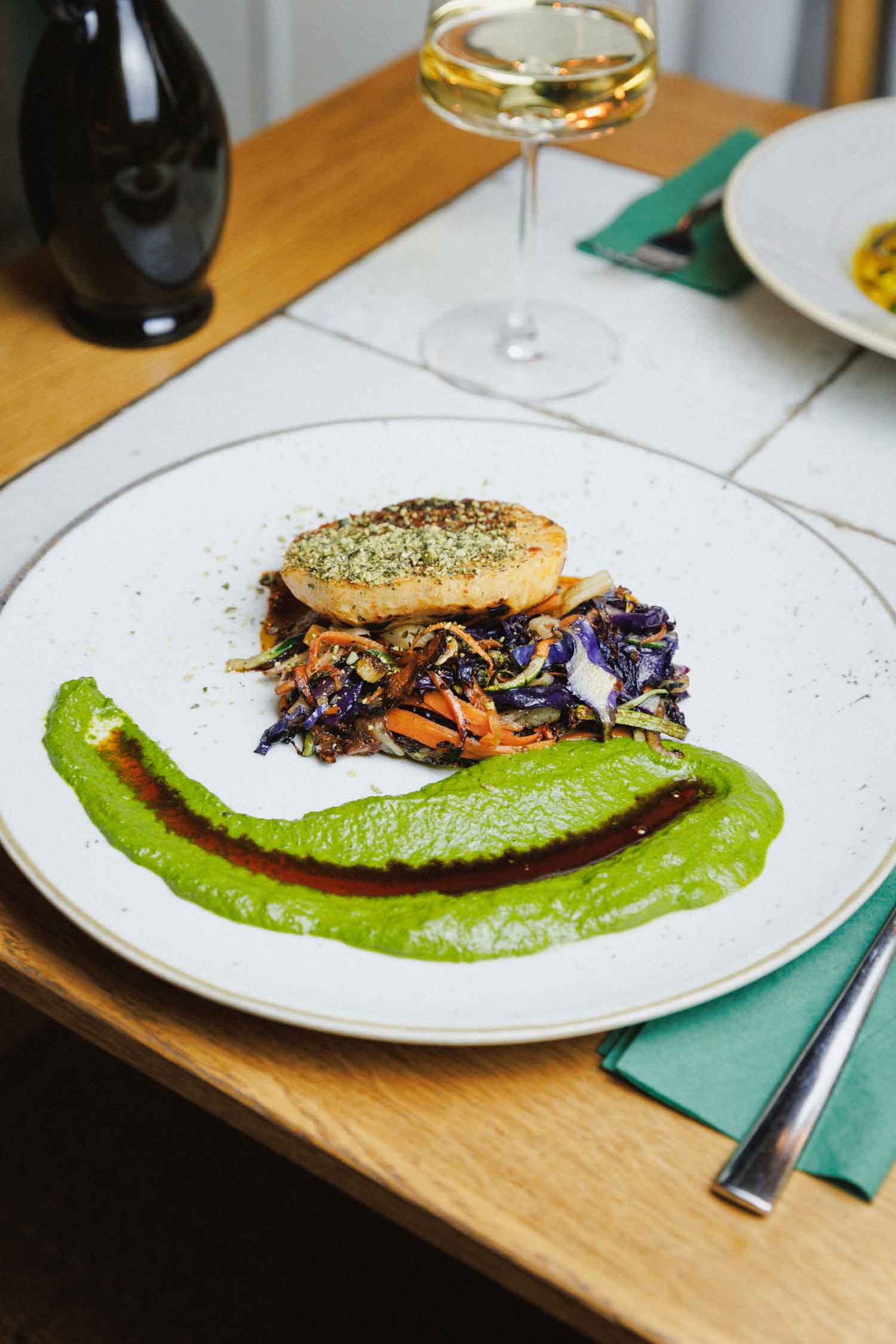 Celer mariniran u harissi i zapečen na lava grillu, wok povrće, krema od baby špinata i indijskih oraščića, soja dressing, mrvljene bučine sjemenke